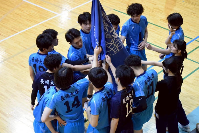 長崎大学全学男子バレーボール部は昨年度、秋季九州大学リーグチャレンジマッチ沖縄大会において優勝し、今年度から2年ぶりに一部リーグに昇格し、今年度の春季リーグ戦では8チーム中5位という成績を残しました。