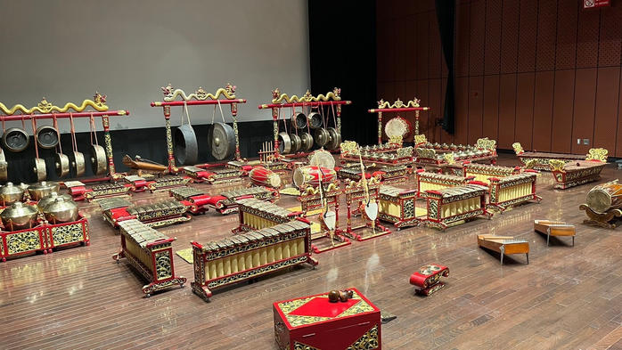 みなさんはガムランをご存知ですか?ガムランは、インドネシアの伝統音楽で、古代ジャワ語の「ガムル(叩く)」という言葉が由来とされており、叩いて鳴らす楽器を中心に構成されています。その他にも弦楽器や歌などが入って大編成での演奏もします。その中でも、私たちは中部ジャワのガムランを演奏しています。中部ジャワのガムランはゆったりと流れるような響き、異なる楽器の音色の響きを持っており王宮の儀式のほか結婚式やジャワ舞踊、ワヤンクリットという影絵芝居の伴奏など様々な場面で演奏されます。